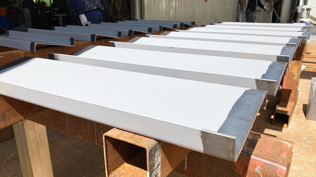 工場用加工図を元に、鋼材の切断、仮付組立、溶接、防錆塗装を行います。